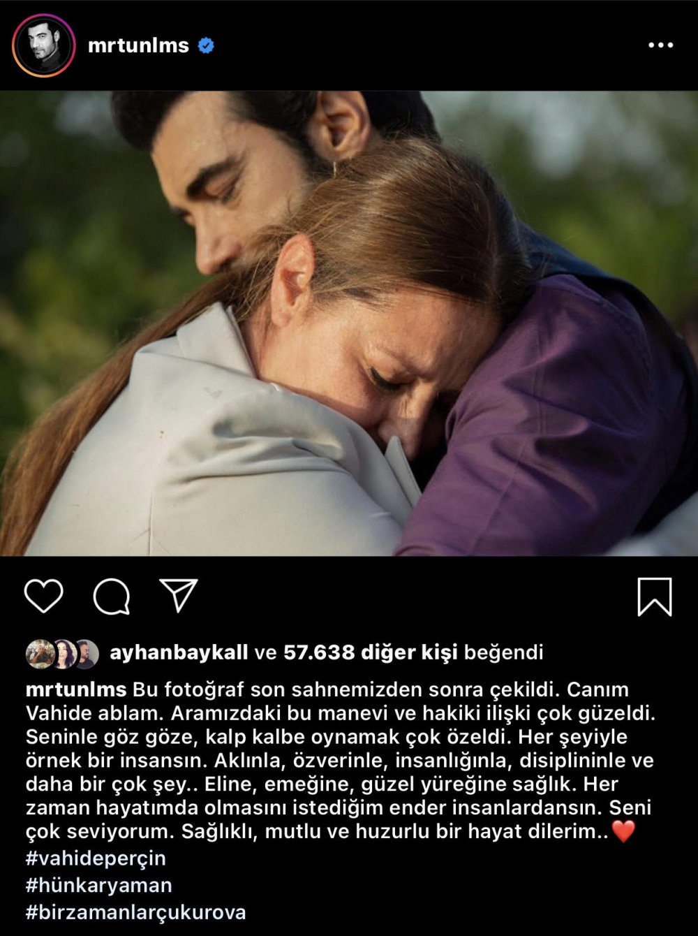 Ünalmış Instagram hesabından yaptığı paylaşımda usta oyuncuya “Bu fotoğraf son sahnemizden sonra çekildi. Canım Vahide ablam. Aramızdaki bu manevi ve hakiki ilişki çok güzeldi. Seninle göz göze, kalp kalbe oynamak çok özeldi. Her şeyiyle örnek bir insansın. Aklınla, özverinle, insanlığınla, disiplininle ve daha birçok şey.. Eline, emeğine, güzel yüreğine sağlık. Her zaman hayatımda olmasını istediğim ender insanlardansın. Seni çok seviyorum. Sağlıklı, mutlu ve huzurlu bir hayat dilerim.” sözleriyle sevgisini dile getirdi.