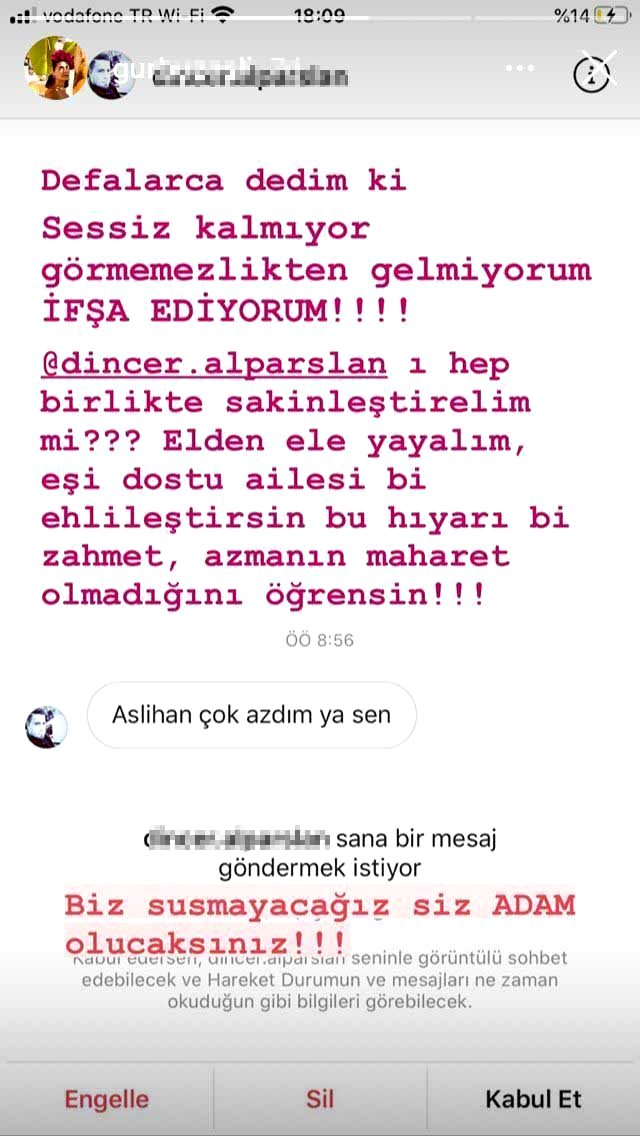 Gürbüz, bir erkek takipçisinin Intagram'dan attığı müstehcen mesajı paylaşarak "Defalarca dedim ki sessiz kalmıyor görmemezlikten gelmiyorum ifşa ediyorum. Biz susmayacağız siz adam olacaksınız" dedi.