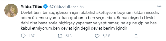 Sosyal medyayı aktif olarak kullanan sanatçı Yıldız Tilbe Twitter hesabından yaptığı paylaşımda "Ben devlet için değil devlet benim içindir." dedi.