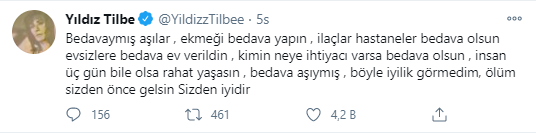 Ünlü şarkıcı devamında; "Bedavaymış aşılar, ekmeği bedava yapın, ilaçlar hastaneler bedava olsun evsizlere bedava ev verilsin. Kimin neye ihtiyacı varsa bedava olsun, insan üç gün bile olsa rahat yaşasın... Bedava aşıymış! Böyle iyilik görmedim... Ölüm sizden önce gelsin, sizden iyidir..." dedi.