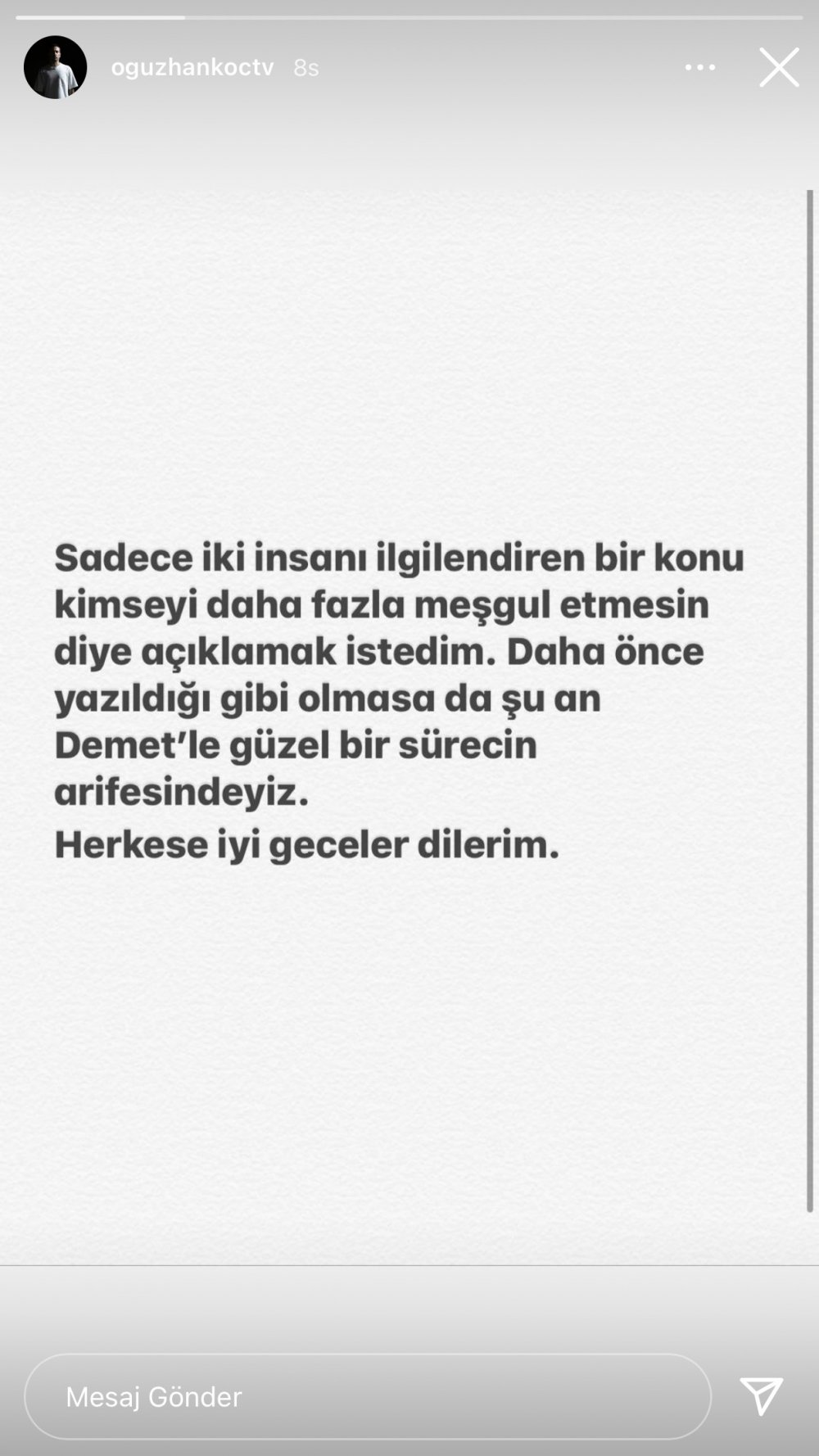 Oğuzhan Koç da sosyal medya hesabından yaptığı paylaşımla ilişkiyi doğruladı. Koç; "Daha önce yazıldığı gibi olmasa da şu an Demet’le güzel bir sürecin arifesindeyiz." ifadelerini kullandı.
