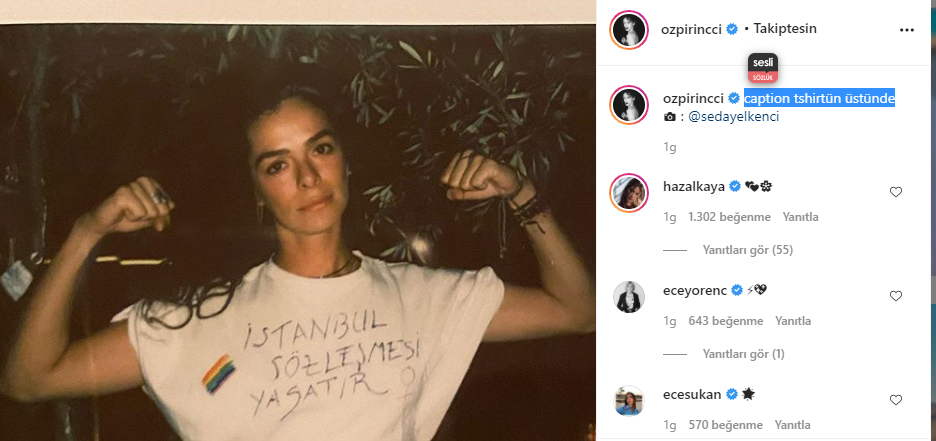 Özpirinçci yaptığı son paylaşımla bu kez İstanbul Sözleşmesi'ne destek oldu. Üstünde İstanbul Sözleşmesi Yaşatır yazılı bir tişörtle poz veren oyuncu, fotoğrafa "caption tshirtün üstünde" notunu düştü.