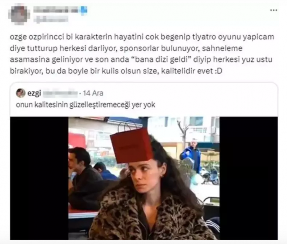 Bir sosyal medya kullanıcısı, "Özge Özpirinçci bir karakterin hayatını çok beğenip, 'tiyatro oyunu yapacağım' diye tutturup herkesi darlıyor. Sponsorlar bulunuyor, sahneleme aşamasına geliniyor ve son anda 'Bana dizi geldi' diyerek herkesi yüzüstü bırakıyor. Bu da böyle bir kulis olsun size" mesajını yazdı.