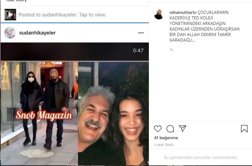 Tamer Karadağlı ile aşk yaşadığı Iraz Yıldız'ın fotoğrafını paylaşan Reha Muhtar "Çocuklarımın kaderiyle TED Koleji yönetimindeki arkadaşın kadınlar üzerinden uğraşırsan bir daha Allah demem Tamer Karadağlı" ifadesini kullandı.