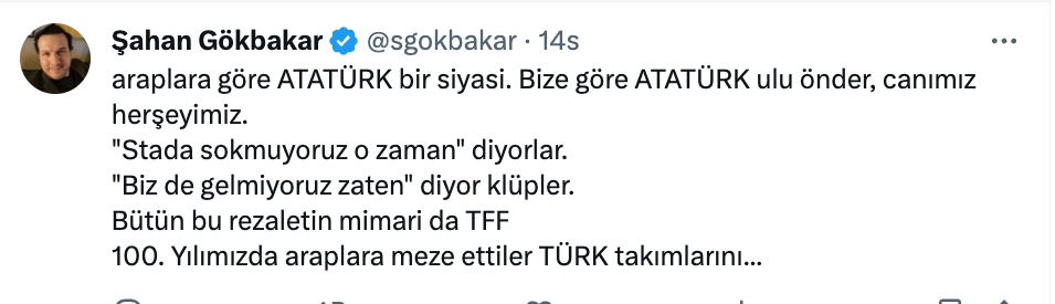 Suudi yönetiminin Galatasaray ile Fenerbahçe'ye Atatürk pankartı, tişörtü ve İstiklal Marşı'na izin vermediği haberleri gündeme düşünce sosyal medya yıkıldı. Şahan Gökbakar da konuya dair TFF Başkanı'na tepki göstererek şunları yazdı: