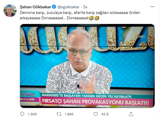 Beyaz TV'deki magazin programında "Fırsatçı Şahan provakasyonu başlattı" başlığını gören Gökbakar, aynı kanalda yayınlanan "cin çıkarma" seansına göndermede bulunarak Beyaz TV’ye yanıt verdi: "Demona karşı, zuzulaya karşı, afarite karşı sağdan solaaaaaa önden arkayaaaaa Donaaaaaat.. Donaaaaaat"