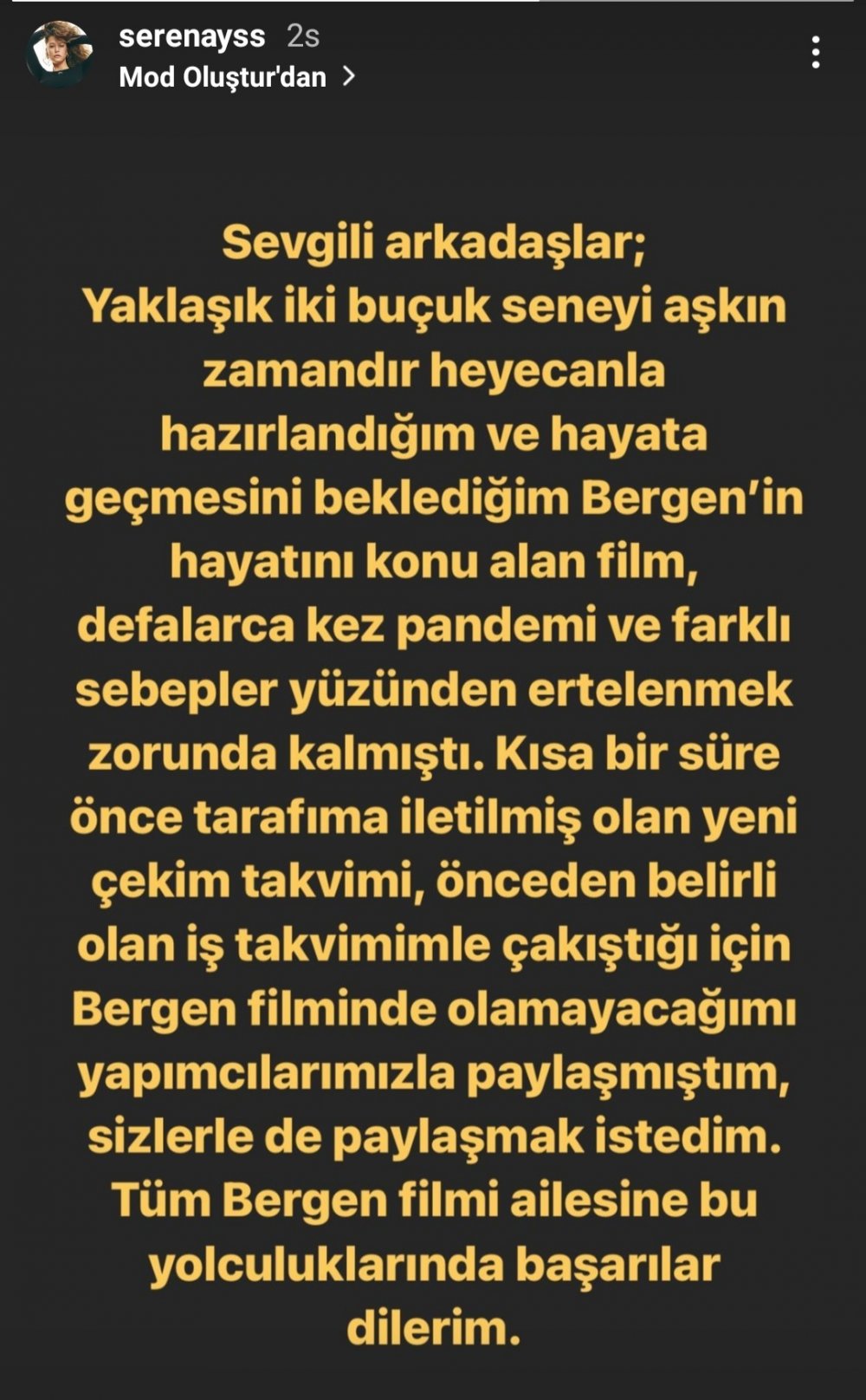 “Kısa bir süre önce tarafıma iletilmiş olan yeni çekim takvimi, önceden belirli olan iş takvimimle çakıştığı için ‘Bergen’ filminde olamayacağımızı yapımcılarımızla paylaşmıştım, sizlerle de paylaşmak istedim. Tüm ‘Bergen’ filmi ailesine bu yolculuklarında başarılar dilerim.”