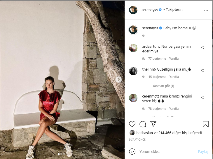 Uzun süredir tatilde olan Serenay Sarıkaya, yeni çektirdiği fotoğrafları sosyal medya hesabından yayınladı ve fotoğraflara, "Bebeğim evdeyim" notunu düştü. Oyuncu son olarak kırmızı süper mini elbisesiyle hayranlarından tam not aldı.