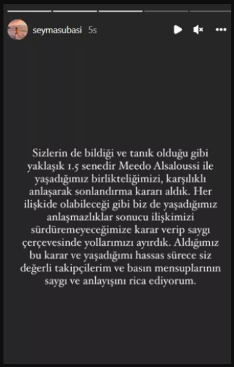 Şeyma Subaşı açıklamasında "Karşılıklı anlaşarak sonlandırma kararı aldık. Her ilişkide olabileceği gibi biz de yaşadığımız anlaşmazlıklar sonucu ilişkimizi sürdüremeyeceğimize karar verip saygı çerçevesinde yollarımızı ayırdık" dedi.