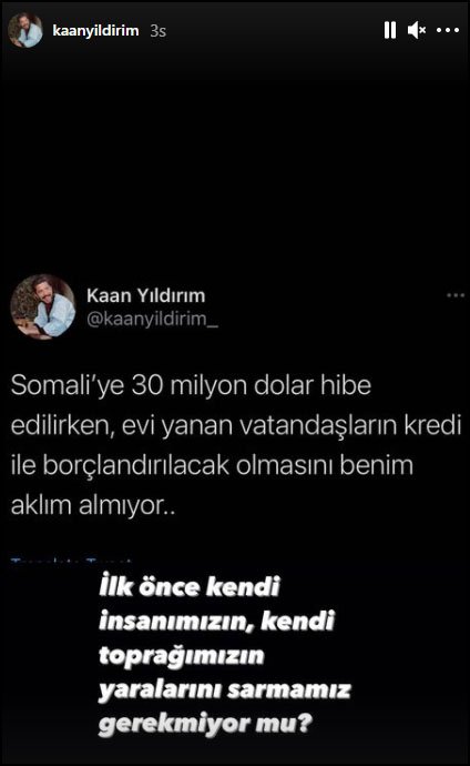 Instagram hesabından bu karara isyan eden oyuncu Kaan Yıldırım da “Somali’ye 30 milyon dolar hibe edilirken, evi yanan vatandaşların kredi ile borçlandırılacak olmasını benim aklım almıyor. İlk önce kendi insanımızın, toprağımızın yaralarını sarmamız gerekmiyor mu?” ifadelerini kullandı.