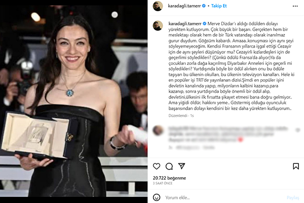 Karadağlı'nın Instagram'da yaptığı paylaşım şöyle: "Merve Dizdar'ı aldığı ödülden dolayı yürekten kutluyorum. Çok büyük bir başarı. Gerçekten hem bir meslektaşı olarak hem de bir Türk vatandaşı olarak inanılmaz gurur duydum. Göğsüm kabardı. Amaaa...konuşması için aynı şeyi söyleyemeyeceğim. Kendisi Fransanın yıllarca işgal ettiği Cezayir için de aynı şeyleri düşünüyor mu? Cezayirli kızkardeşleri için de geçerlimi söyledikleri? (Çünkü ödülü Fransa'da alıyor) Ya da çocukları zorla dağa kaçırılmış Diyarbakır Anneleri için geçerli mi söyledikleri? Yurtdışında böyle bir ödül alırken onu bu ödüle taşıyan bu ülkenin okulları, bu ülkenin televizyon kanalları. Hele ki en popüler işi TRT'de yayınlanan dizisi. Şimdi en popüler işini devletin kanalında yapıp, milyonların kalbini kazanıp, para kazanıp, sonra yurtdışında böyle önemli bir ödül alıp, devletini, ülkesini ilk fırsatta şikayet etmesi bana doğru gelmiyor... Ama yiğidi öldür, hakkını yeme... Göstermiş olduğu oyunculuk başarısından dolayı kendisini bir kez daha yürekten kutluyorum..."