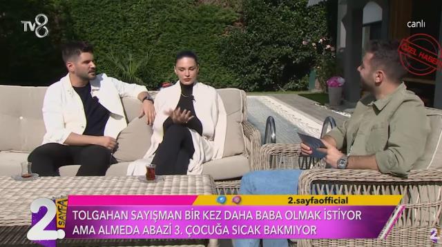 Efehan ve Alina adını verdikleri iki çocukları bulunan Tolgahan Sayışman ve Almeda Abazi çifti, evlerinin kapılarını 2. Sayfa programına açtı. Evlerinin bahçesinde röportaj veren ikili, harcamalardan bahsederken gerildi.