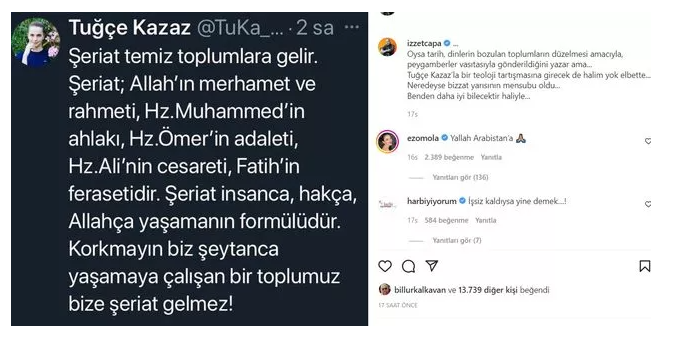 Tuğçe Kazaz'ın yaptığı yorumu gören Ezgi Mola kendini tutamadı. Son dönemde Erşan Kuneri dizisindeki performansıyla gündeme gelen Mola, İzzet Çapa'ın yorumunun altına "Yallah Arabistan’a" yazdı.
