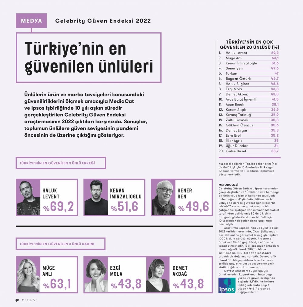 MediaCat Celebrity Güven Endeksi 2022 Raporu, geçen günlerde açıklandı. “Türkiye’nin En Çok Güvenilen 20 Ünlüsü” listesinde %63,1 oranla Müge Anlı ikinci olurken, Kenan İmirzalıoğlu %51,6 oranla üçüncü sırada yer aldı. Namı diğer “Türkiye’nin en güvenilir ünlüleri “ araştırmasının sonuçlarına göre, Müge Anlı Türkiye’nin en çok güvenilen ünlü kadını oldu.