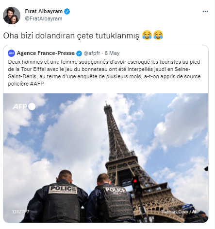İki ay önce Fransa'nın başkenti Paris'e tatile giden oyuncu çift Fırat Albayram ve Ceyda Kasabalı, Eyfel Kulesi'nin önünde dolandırılmıştı. Albayram, kendilerini 150 euro dolandıran çetenin tutuklandığını açıkladı