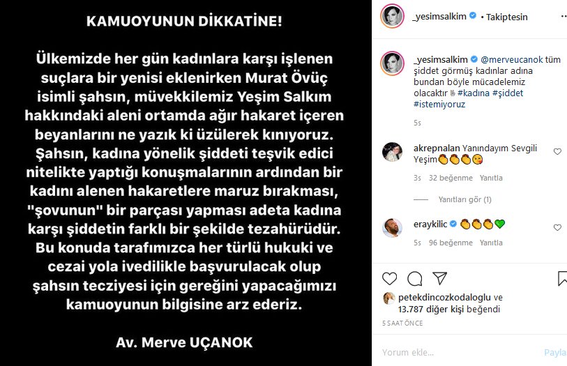 Murat Övüç’ün Pınar Gültekin cinayeti sonrası ortaya çıkan videosunda kadınlar hakkında, “Ne olacak bu kadınlar? Şiddete uğradık, tacize uğradık, bizi vurdular. Tutun dilinizi. Kadın her zaman erkeğin bir adım gerisinde olmak zorunda. Bizim kadınlar maalesef ki adama saydırıyorlar, küfür ediyorlar, gaza getiriyorlar. Ee erkekler de…” sözlerine Yeşim Salkım tepki göstermiş. Övüç’ü “Eğer haddini aşıp da bize kadınlığı öğretmeye kalkarsan seni o takip eden ve arkanda olduğunu zannettiğin kadınlar da kurtaramaz. Sen ve senin gibiler bu ülkede kadının yerini konumlandıracak en son insanlarsınız. ‘Kadın erkeğin bir adım gerisindedir’ gibi kullandığın basiretsiz ve çirkin sözlerin yüzünden sen ve senin gibi maalesef toplumu yanlış yönlendirenler yüzünden bugün bir genç bir kadın daha varilden ceset torbasına kondu. Haddinizi bilin” sözleriyle eleştirmişti.