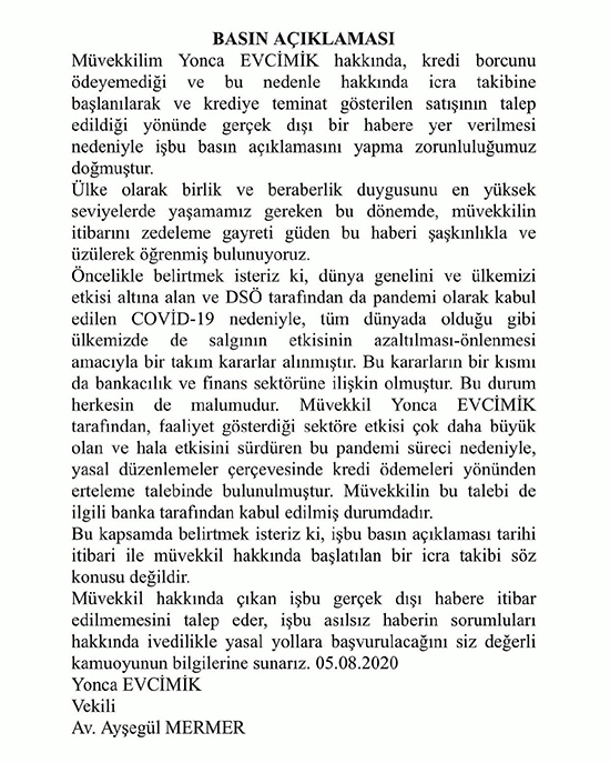 Evcimik sosyal medya hesabından hakkında çıkan haberleri “Sabah uyandım bir baktım haberlere ben! Evimden olmuşum… ama bundan benim haberim yok! İnsanlar pandemi ile uğraşırken, çözülmesi gereken onca sorun varken böyle ‘asılsız’, astı astarı olmayan haciz haberleri ile gündemi meşgul etmesek mi acaba? Her şeyi geçtim keşke bunu haber yapmadan önce beni arayıp doğruluk payı var mı diye sorsaymışsınız” sözleriyle yalanladı.