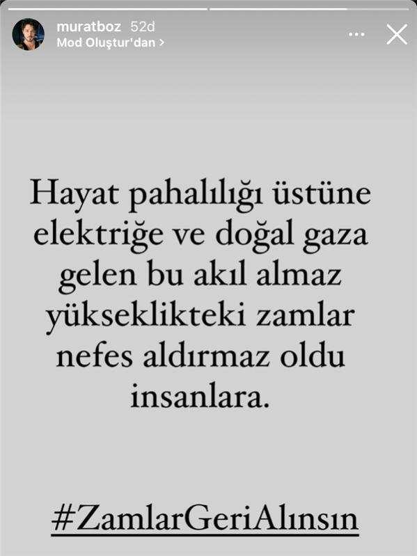 Cem Yılmaz, Şahan Gökbakar, Seray Sever, Yeşim Salkım, Serkan Kaya, Gürgen Öz, Gülse Birsel, Oğuzhan Uğur ve İdo Tatlıses'ten sonra son dönemde yapılan zamlara bir tepki de Murat Boz'dan geldi.