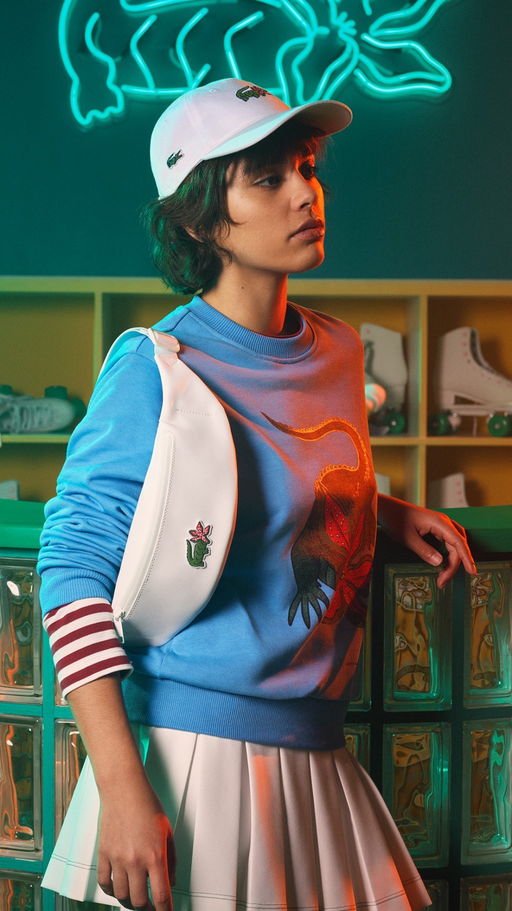 Moda tutkunlarına kişisel tarzlarını favori dizileri üzerinden yeniden ifade etme imkânı sunan koleksiyonda, Lacoste’un ünlü timsahını nakışlı ya da flok baskı olarak bulmak mümkün. Üstelik bazen Bridgerton dizisindeki Kraliçe Charlotte’un peruğuyla, bazense yüzü Stranger Things’teki korkunç Demogorgon’a dönüşmüş halde.