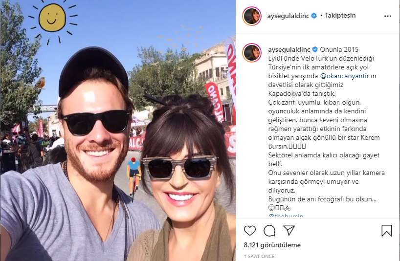 Çok sayıda beğeni alan paylaşımda Aldinç; "Onunla 2015 Eylül’ünde Türkiye'nin ilk amatörlere açık yol bisiklet yarışında @okancanyantir'ın davetlisi olarak gittiğimiz Kapadokya'da tanıştık. Çok zarif, uyumlu, kibar, olgun, oyunculuk anlamında da kendini geliştiren, bunca seveni olmasına rağmen yarattığı etkinin farkında olmayan alçak gönüllü bir star Kerem Bursin.