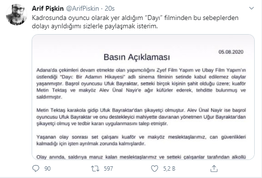 Açıklamada set çalışanı iki kişinin can güvenliklerinin kalmaması sebebiyle işten ayrıldıkları bildirildi. Ufuk Bayraktar'ın daha önce de sete alkollü geldiği ve sahnesinin çekilemediği, yönetmene ağır küfürler ettiği söylenirken yönetmen Uğur Bayraktar'ın da Ufuk Bayraktar'ı desteklediği ve her ikisinden de şikayetçi olunduğu açıklandı.