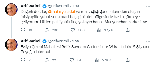 Verimli, yaptığı paylaşımla “Değerli dostlar, @mahiryesildal ve ruh sağlığı gönüllülerinden oluşan inisiyayifle şubat sonu mart başı gibi afet bölgesinde hasta görmeye geliyorum. Lütfen psikiyatrik ilaç yollayın bana.. Muayenehane adresime..” dedi.