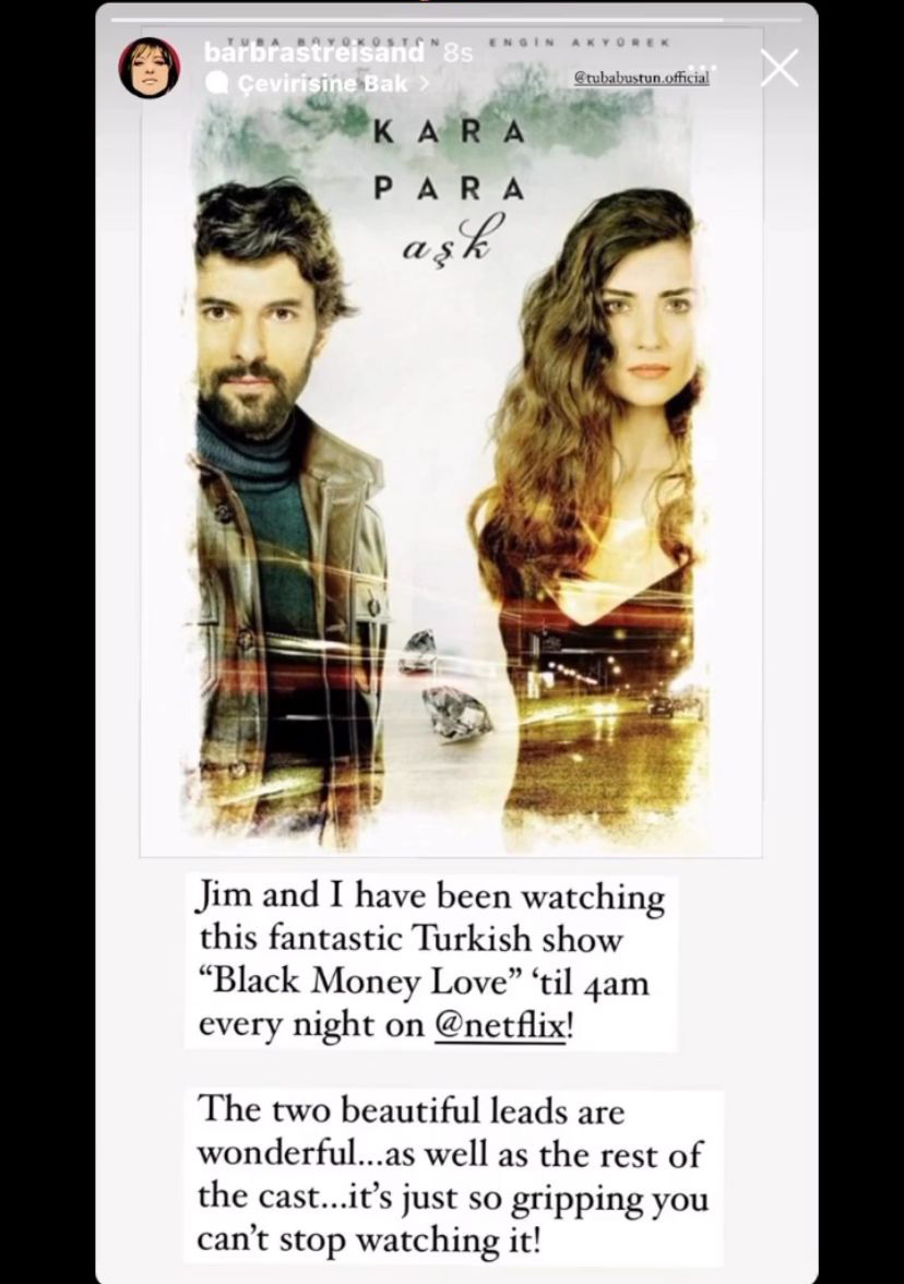 Barbra Streisand, "Jim ve ben, bu harika Türk dizisi Kara Para Aşk'ı her gece 4'e kadar Netflix üzerinden izliyoruz. İki güzel başrol harikalar. Tıpkı kadronun geri kalanı gibi. Seni o kadar iyi yakalıyor ki izlemeyi kesemiyorsun." sözleriyle diziyi ne kadar beğendiğini belirtti.