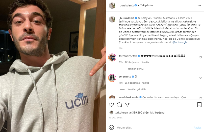 Ünlü isimler arasında Burak Deniz de yer alıyor. Deniz sosyal medya hesabından yaptığı paylaşımla kampanyaya destek olduğunu duyurdu. Oyuncu "Ben de; çocuk istismarına dikkat çekmek ve farkındalık yaratmak için Ucim Saadet Öğretmen Çocuk İstismarı ile Mücadele derneği tişörtü ile İstanbul Maratonu’nda olacağım. Siz de Ucim’e destek vermek isterseniz www.ucim.org.tr adresinden gönüllü üye olabilir ya da düzenli bağışçı olarak istismara uğrayan çocuklarımızın yanında olabilirsiniz. Hadi siz de Ucim’e destek olun. Çocuklar konuşacak ucim yanlarında olacak @ucimorgtr" ifadelerini kullandı.