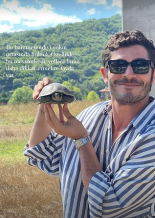 Sevgilisi Didem Soydan'la birlikte yolculuk ederken yolun ortasında bulduğu kampumbağayı paylaşan Deniz "Bu hanımefendiyi yolun ortasında bulduk. Özellikle bu mevsimde yollara biraz daha dikkat etmekte fayda var" notunu düştü.