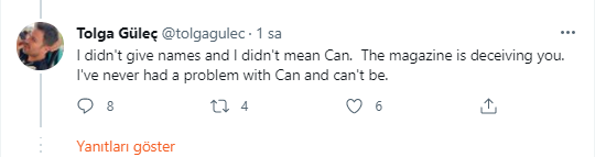 Güleç Twitter'da yazılan bir hayran mesajına "İsim vermedim ve Can'ı kastetmedim. Magazin sizi aldatıyor. Can'la hiçbir zaman bir sorunum olmadı ve olamaz." yanıtını verdi.
