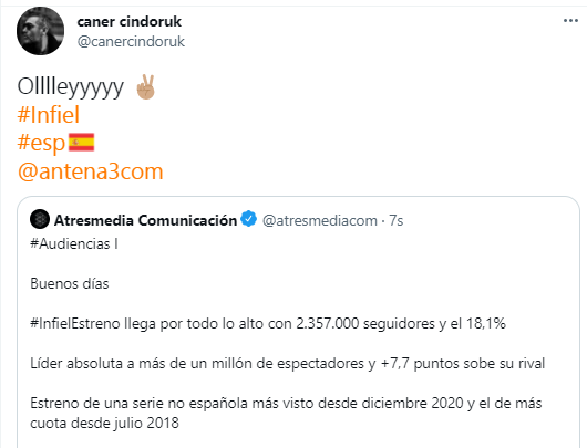 Infiel adıyla ekrana gelen dizi 2 milyon 357 bin seyirci ve yüzde 18.1 ile izlenme oranıyla zirveye yerleşti. Cansu Dere ve Caner Cindoruk'un başrolünü üstlendiği, Medyapım imzalı Sadakatsiz’in en yakın rakibine 7.7 puan fark attı.