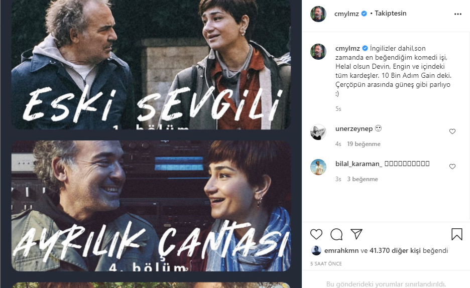 Instagram hesabından dizinin fotoğrafını paylaşan Yılmaz; "İngilizler dahil, son zamanda en beğendiğim komedi işi... Helal olsun Devin, Engin ve içindeki tüm kardeşler. 10 Bin Adım Gain'deki çer çöpün arasında güneş gibi parlıyo :)" ifadelerini kullandı.