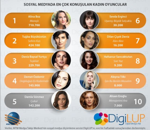 Digilup tarafından yapılan sosyal medya araştırmasına göre, kadın oyuncuların geçen hafta sosyal medyadaki sıralaması belli oldu.