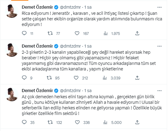 Türkiye'yi yasa boğan felaket sonrası ünlü isimler de sosyal medya hesaplarından geçmiş olsun paylaşımlarında bulundu. Dün "Hayatımın en zor günlerinden birini geçiriyorum..." diyen Demet Özdemir bugün de herkesi yardıma çağırdı.