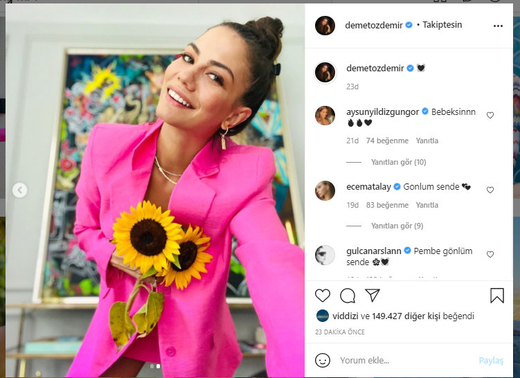 Yeni proje müjdesi merakla beklenen oyuncu Instagram paylaşımlarıyla beğeni almaya devam ediyor. Şu sıralar ünlü isimler kırmızıyı tercih ederken, Özdermir paylaştığı pembe kombiniyle dikkat çekti. Oyuncunun paylaşımına kısa sürede çok sayıda beğeni ve yorum yapıldı.
