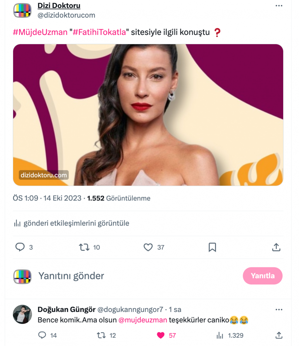 'Kızılcık Şerbeti'nde 'Alev Arslan'a hayat veren Müjde Uzman ol arkadaşı Doğukan Güngör’ün canlandırdığı Fatih karakterine tepki olarak açılan ‘Fatih’i Tokatla’ sitesiyle ilgili konuştu ve “Ben üzülürüm öyle şeylere. Gülmüyorum öyle şeylere, bence komik değil.” dedi.