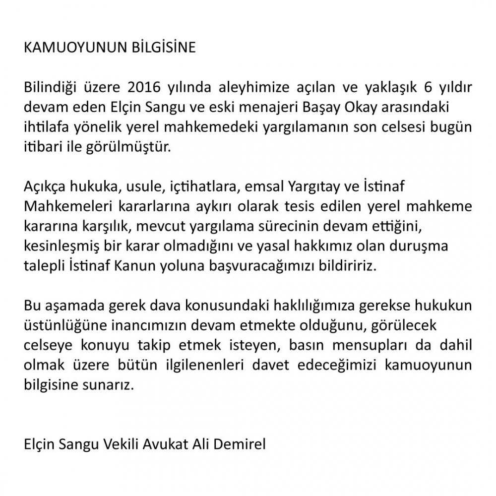 Kararın ardından Elçin Sangu isyan etti. Oyuncu sosyal medya hesabından "Bu zamana kadar hep sessiz kaldım ama artık yeter! Bu güne kadar bana yapılanları anlatmadım fakat daha fazla susmayacağım! Bu da hepinize açık davetimdir. Sevgilerler…" ifadelerini kullanarak bir açıklama yayınladı.