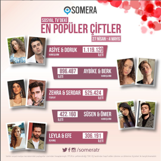 Marka analitiği ve TV analitiği konularında detaylı sosyal medya analizleri ile kurumlar, markalar ve TV sektörüne hizmet veren Somera sosyal medyada 27 Nisan - 4 Mayıs arasında en popüler çifti açıkladı.