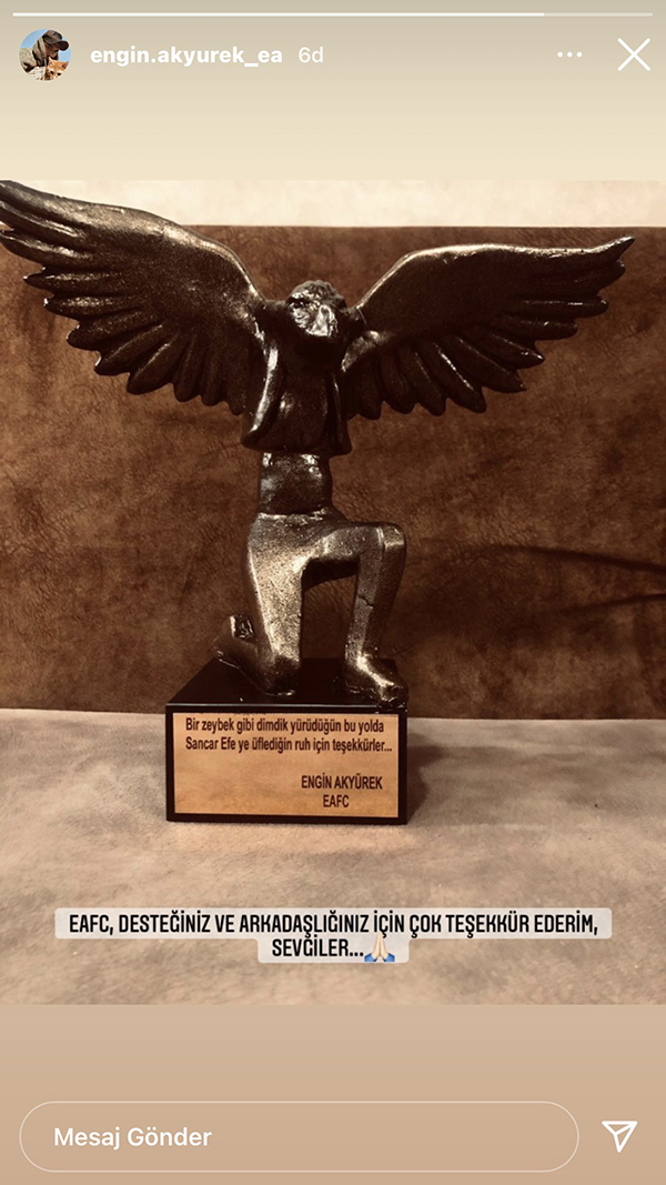 Dizinin setine giden hayranları üzerinde "Bir zeybek gibi dimdik yürüdüğün bu yolda Sancar Efe'ye üflediğin ruh için teşekkürler" yazan bir heykeli oyuncuya teslim etti.