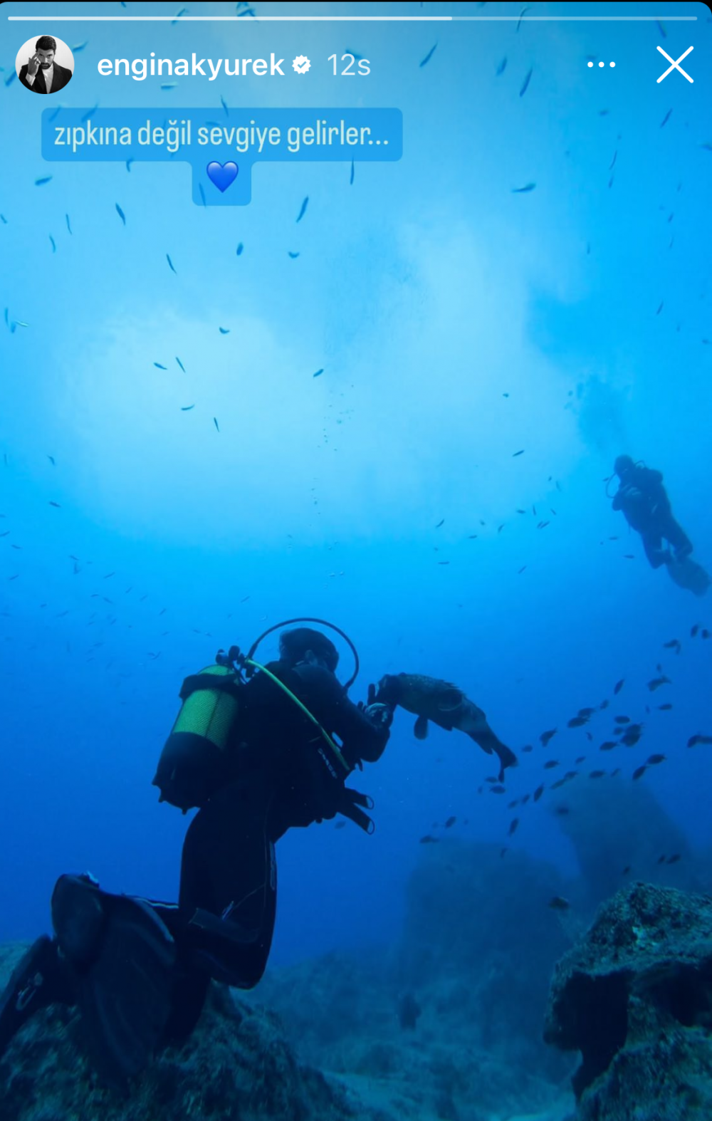 Dalış yaptığı ve bir balıkla olduğu kareyi paylaşan Akyürek gönderisine "Zıpkına değil, sevgiye gelirler" notunu düştü.