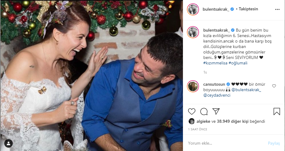 Sosyal medyayı aktif olarak kullanan Şakrak ve Düvenci yıl dönümlerine dair paylaşım yaptı. Düğünlerinden bir kareyi paylaşan Bülent Şakrak, fotoğrafa "Bu gün benim bu kızla evliliğimin 6. senesi... Hastasıyım kendisinin, ancak o da bana karşı boş değil... Gülüşlerine kurban olduğum, gamzelerine gömsünler beni... Seni SEVİYORUM" notunu düştü.