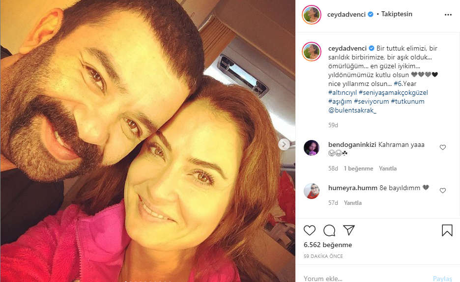 Ceyda Düvenci ise "Bir tuttuk elimizi, bir sarıldık birbirimize, bir aşık olduk... Ömürlüğüm... En güzel iyikim... Yıl dönümümüz kutlu olsun, nice yıllarımız olsun..." notuyla birlikte eşiyle fotoğraflarını paylaştı.