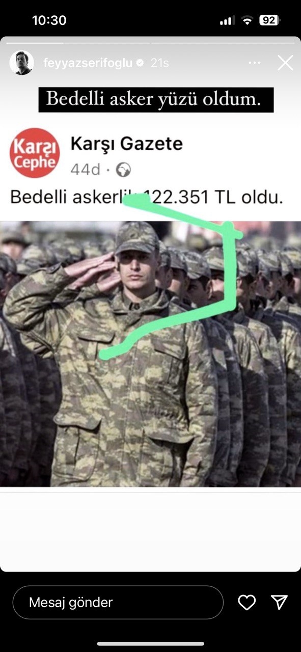 Bir haber sitesi bedelli askerlikle ilgili haberine görsel olarak, Feyyaz Şerifoğlu'nun fotoğrafını kullandı. Bunu fark eden oyuncu haberi alıntılayarak sosoyal medya hesabından "Bedelli asker yüzü oldum" notunu paylaştı.