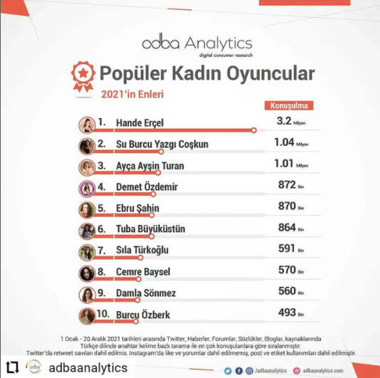 Adba sosyal medyada 2021’nin en çok konuşulanlarını belirledi. Çıkan sonuca göre, geride bıraktığımız yıl içerisinde dijital dünyada en çok konuşulan kadın oyuncu Hande Erçel oldu.