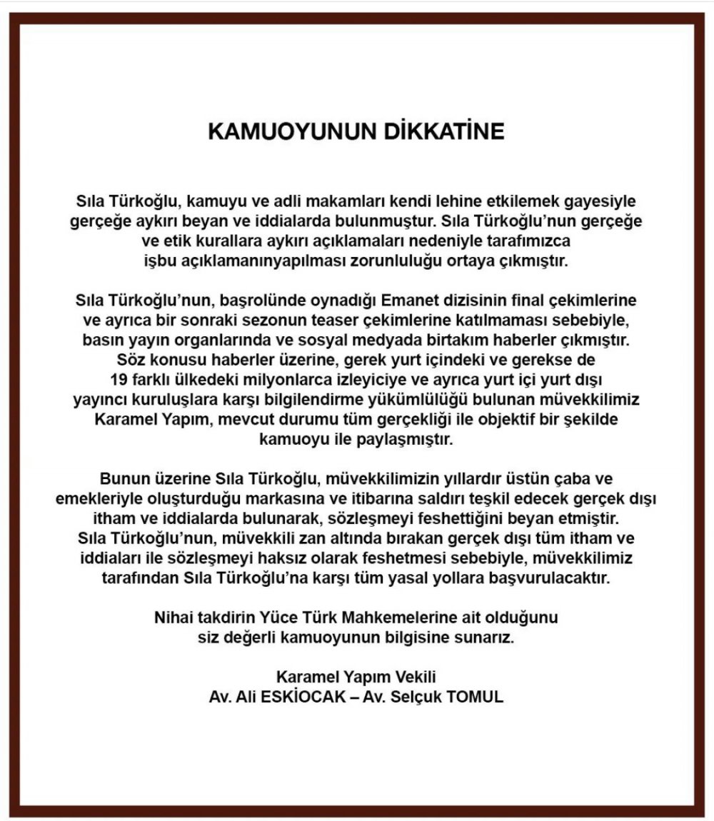 "Emanet’in Seher’i Sıla Türkoğlu ve dizinin yapımcısı Karamel Yapım arasında sular durulmuyor. Karamel Yapım önceki yaptığı açıklamayla oyuncuyu suçlamış ardından da Türkoğlu avukatı aracılığıyla bir açıklama yapmıştı.