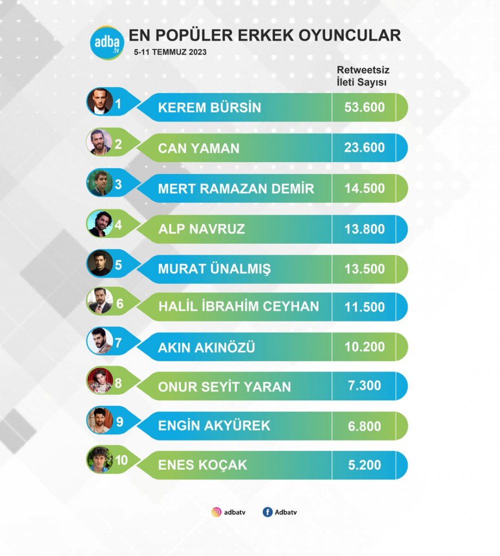 Adba 5-11 Temmuz arasında sosyal medyada en çok konuşulan erkek oyuncuları belirledi. Çıkan sonuca göre, en çok konuşulan erkek oyuncu Kerem Bürsin oldu.