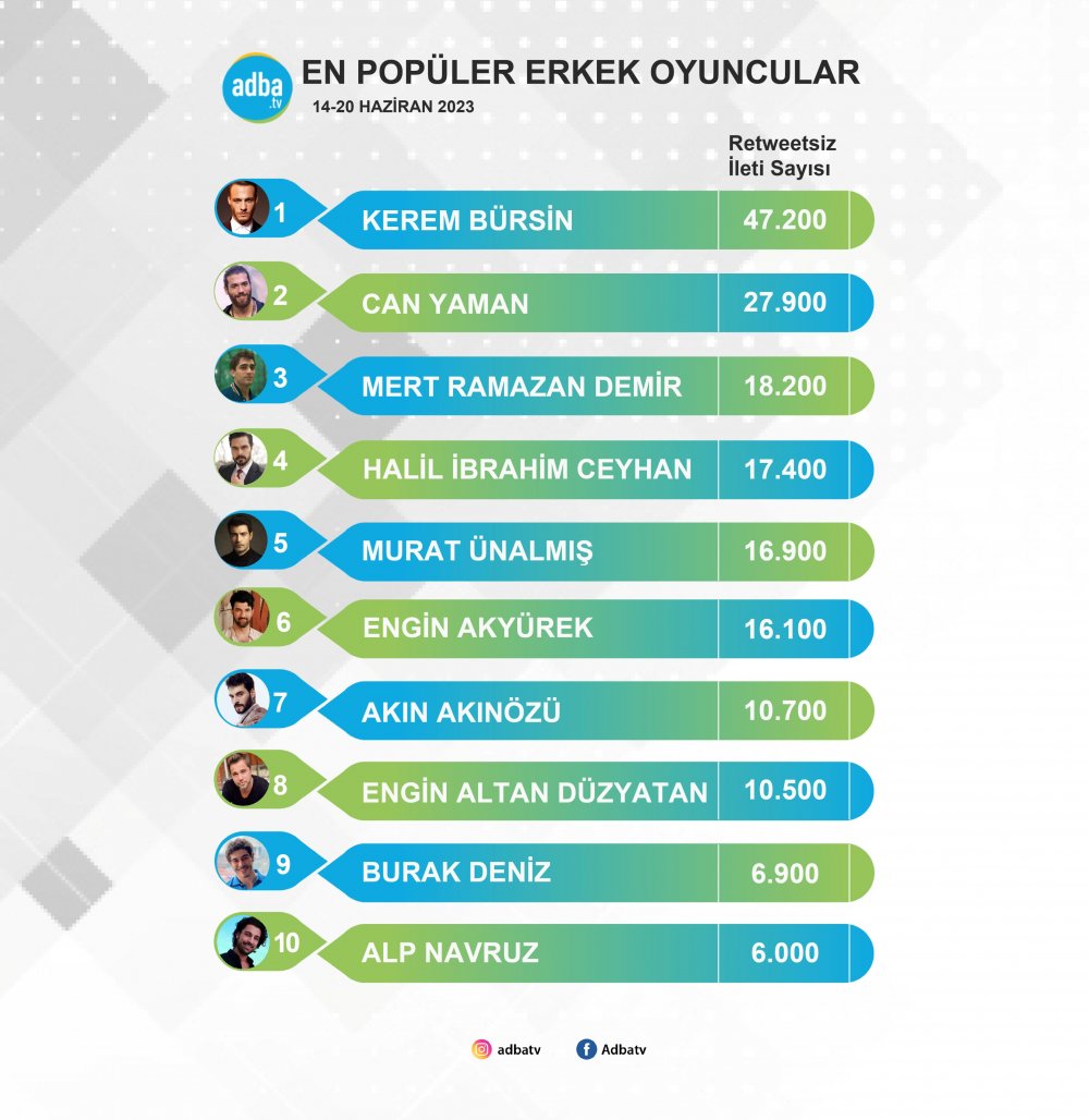 Adba 14-20 Haziran arasında sosyal medyada en çok konuşulan erkek oyuncuları belirledi. Çıkan sonuca göre, en çok konuşulan erkek oyuncu Kerem Bürsin oldu.