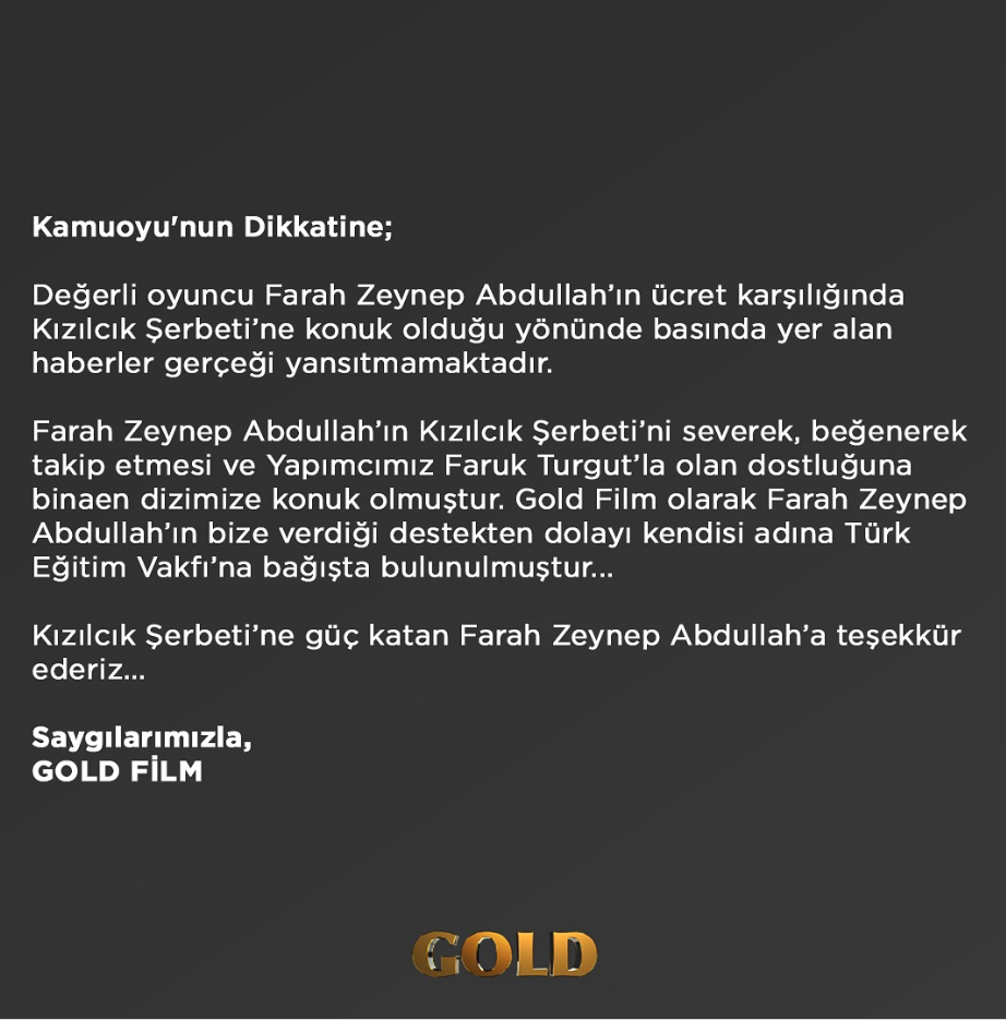 Dizinin yapımcısından oyuncuyla ilgili bir açıklama yapıldı. Gold Film, Farah Zeynep Abdullah'ın diziden ücret almadığını belirtti.