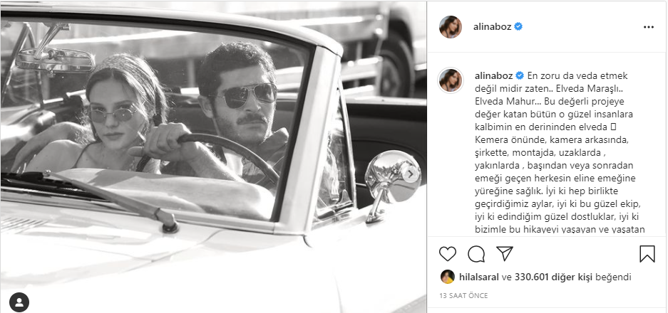 Kamera önünde, kamera arkasında, şirkette, montajda, uzaklarda , yakınlarda , başından veya sonradan emeği geçen herkesin eline emeğine yüreğine sağlık. İyi ki hep birlikte geçirdiğimiz aylar, iyi ki bu güzel ekip, iyi ki edindiğim güzel dostluklar, iyi ki bizimle bu hikayeyi yaşayan ve yaşatan seyircimiz,İYİ Kİ Maraşlı." iafdelerini kullandı.