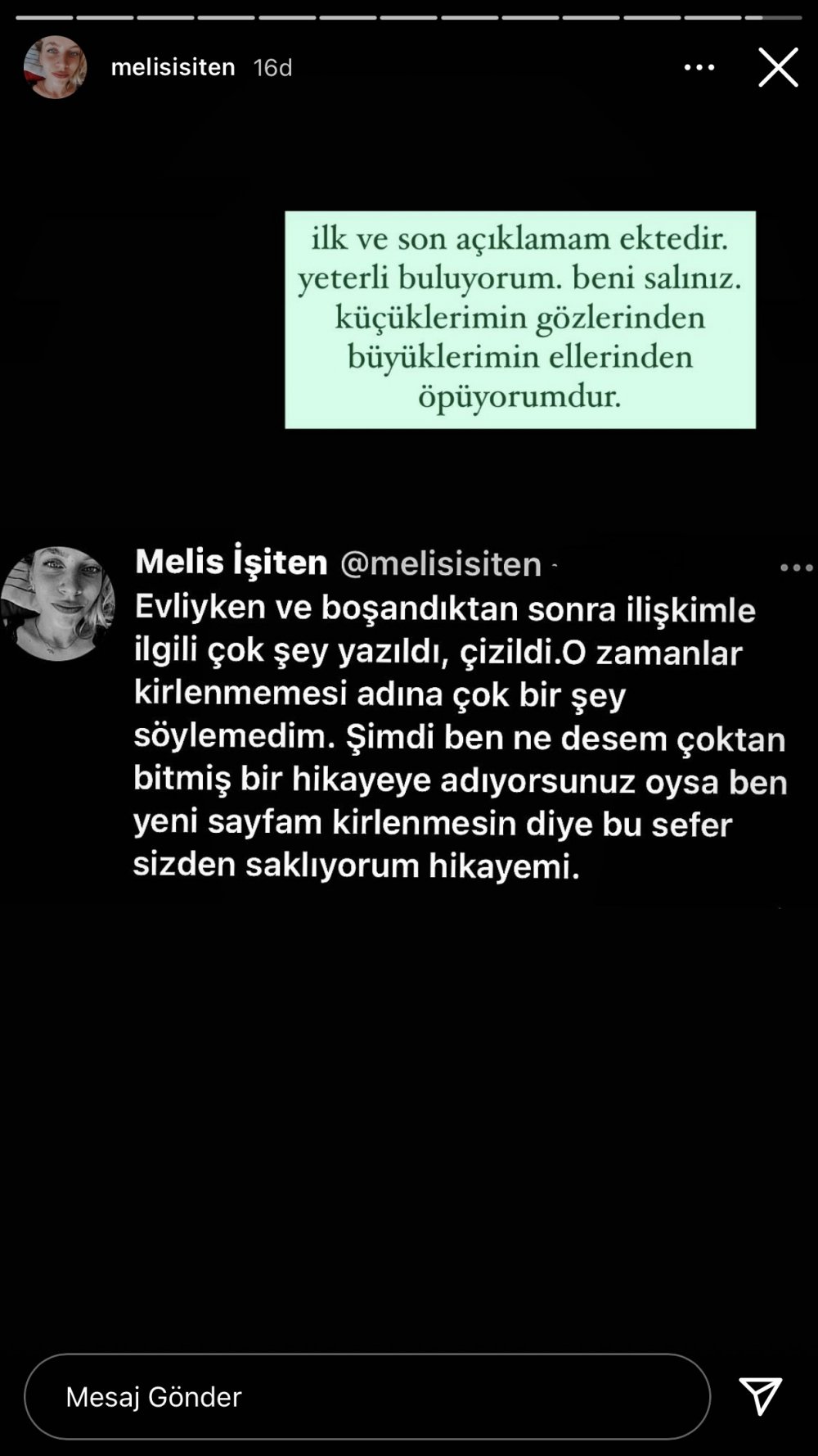 Yapılan yorumlar üzerine Melis İşiten yeni bir paylaşım yaptı ve şu ifadeleri kullandı; "Evliyken ve boşandıktan sonra ilişkimle ilgili çok şey yazıldı, çizildi. O zamanlar kirlenmemesi adına çok bir şey söylemedim. Şimdi ben ne desem çoktan bitmiş bir hikayeye adıyorsunuz oysa ben yeni sayfam kirlenmesin diye bu sefer sizden saklıyorum hikayemi"